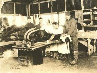 | Keywords: USArmyVetHospitalWWIOperationInProgress.jpg World War I photograph of a field veterinarian operating on an injured horse secured to The Simplicity Equine a portable table which was being used by the US Army Signal Corps WWI was the last major war in which horses were utilized Although their scale of recruitment was relatively small they had to endure the more advanced fire power deployed in the war Advances in medicine and surgery resulted in more available treatment options http //freepages genealogy rootsweb ancestry com/~gregkrenzelok/veterinary 20corp 20in 20ww1/wwisignalcorpspicturessvetcorpsremount html WWI Signal Corps Pictures 1914 “1918 Unknown photographer with US Army signal corps PD-USGov Original upload log page en wikipedia USArmyVetHospitalWWIOperationInProgress jpg 2009-03-31 11 24 Fowler fowler 700×527× 64699 bytes <nowiki> World War I photograph of a field veterinarian operating on an injured horse secured to The Simplicity Equine a portable table which was being used by the US Army Signal Corps WWI was the last major war in which hors</nowiki> History of veterinary medicine Veterinary medicine for horses Veterinary hospitals Veterinary surgery Veterinarians from the United States Horses in World War I Black and white photographs of horses |