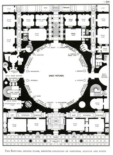 | Keywords: USCapitolBuildingRotundaDetail.jpg en Floor plan of the central area of the U S Capitol building around the Rotunda The caption to this image in the source book states The Rotunda second floor showing locations of paintings statues and busts North is to the left the Senate wing ; the upward direction is west toward the Mall; south is to the right the House of Representatives wing ; down is to the east toward the Visitors Center the Supreme Court building and the Library of Congress building Art of the United States Capitol page 426 The Rotunda second floor showing locations of paintings statues and busts Washington D C U S Government Printing Office 1978 Author A detail from this image showing just the Rotunda room itself File USCapitolBuildingRotunda jpg United States Capitol rotunda PD-USGov |