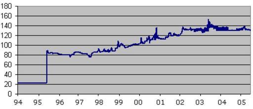 Keywords: USD vs NGN.png Rate of the Nigerian Naira for 1 USD 1994-2005 Source interbank exchange rates publicly available 2005-12-01 own assumed Popo le Chien XY plots Money of Nigeria United States dollar exchange rate charts