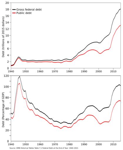 | Keywords: USdebt.svg en United States debt from 1940 to 2015 Red lines indicate the debt held by the public net public debt and black lines indicate the total federal debt gross federal debt the difference being that the gross debt includes that held by the federal government itself The second panel shows the two debt figures as a percentage of U S GDP dollar value of U S economic production for that year The top panel is in 2015 dollars Data source is OMB Historical Tables https //www whitehouse gov/sites/default/files/omb/budget/fy2017/assets/hist07z1 xls Table 7 1 2016-03-16 own Delphi234 other versions cc-zero Debt-to-GDP ratio of the United States |