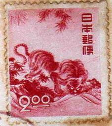 Keywords: Used Japanese New Year Greeting stamp in 1950.JPG ja 日 の1950年用年 切手の使用済 描かれているのは円山 挙のトラである own stamp collection Japan post 1950-02-01 PD-Japan Stamps of Japan 1950 Maruyama Okyo