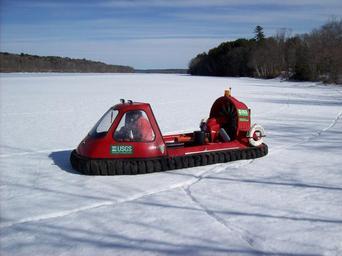| Keywords: usgs science water streamflow river measure measurement maine ice hovercraft ice river iceriver outdoor snow sport boat vehicle Many kids, even a lot of adults, love the idea of driving a hovercraft around! But this hovercraft is vital to the safety of USGS scientists in the field taking measurements in frozen, and partially frozen, rivers. Hovercrafts, like this one, allow our hydrographers to access rivers with unsafe ice conditions more easily. In this shot, we see Nick Stasulis from our Maine office piloting the hovercraft on the Kennebec River near Richmond, Maine. Many kids, even a lot of adults, love the idea of driving a hovercraft around! But this hovercraft is vital to the safety of USGS scientists in the field taking measurements in frozen, and partially frozen, rivers. Hovercrafts, like this one, allow our hydrographers to access rivers with unsafe ice conditions more easily. In this shot, we see Nick Stasulis from our Maine office piloting the hovercraft on the Kennebec River near Richmond, Maine. |
