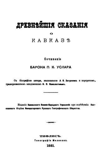 | Keywords: Uslar-Skazanija-o-Kavkaze.jpg en Cover of Petr Uslar's 1886 book ru Обложка книги Усла П К Д евнейшие сказания о Кавказе 1886 Сбо ник сведений о кавказских го цах Вып X Тифлис 1886 Author 1886 PD-old Petr Karlovich Uslar Title pages from Russia 1886 books History books History of the Caucasus Printed books Books published in Tbilisi |