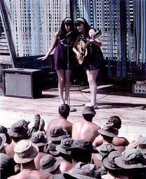 | Keywords: USO Show Vietnam Terrie and Jennie Frankel with guitar entertaining troops with USO 01.jpg en USO Show Vietnam 1968 United Service Organization Jennie and Terrie Frankel sang folk songs played accordions and clarinet and entertained troops in the field boonies in Vietnam with comedian Joey Bishop and their troop from Chicago called The Sig Sakowitz Show Jennie and Terrie were early Doublemint Twins who were given a GS15 rating Colonel rating and travel with escort officer to remote areas to entertain - they did not need electricity Servicemen would wait for hours in the hot sun for their show to arrive - grateful for a welcomed taste of home Others in the troop were Sara Sue from the Gaslight Club and Comedian Tony Diamond They also did shows with Tippi Hedren and Mel Bishop and mingled with Martha Raye at their base at the Saigon Hilton Hotel 2013-06-15 00 05 45 own TwinsofSedona CC-Zero Personality rights I the copyright holder of this work hereby publish it under the following license This file is made available under the Creative Commons CC0 1 0 Universal Public Domain Dedication The person who associated a work with this deed has dedicated the work to the public domain by waiving all of his or her rights to the work worldwide under copyright law including all related and neighboring rights to the extent allowed by law You can copy modify distribute and perform the work even for commercial purposes all without asking permission Creative Commons CC0 1 0 Universal Public Domain Dedication Uploaded with UploadWizard United Service Organizations Vietnam War in 1968 Advertising characters Women with guitars Vietnam War forces of the United States People associated with advertising Purple minidresses William Wrigley Jr Company Identical twins 1960s dresses |