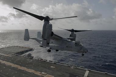 | Keywords: USS America operations 140723-N-LQ799-051.jpg en A tilt-rotor MV-22 Osprey assigned to the Argonauts of Marine Operational Test and Evaluation Squadron VMX 22 takes off from the flight deck of future amphibious assault ship USS America LHA 6 during flight operations America is currently traveling through the U S Southern Command and U S 4th Fleet area of responsibility on her maiden transit America Visits the Americas America is the first ship of its class replacing the Tarawa-class of amphibious assault ships As the next generation big-deck amphibious assault ship America is optimized for aviation capable of supporting current and future aircraft such as the Osprey and F-35B Joint Strike Fighter The ship is scheduled to be ceremoniously commissioned Oct 11 in San Francisco U S Navy photo by Mass Communication Specialist 1st Class Lewis Hunsaker/Released 2014-07-23 Petty Officer 1st Class Lewis Hunsaker https //www dvidshub net/image/1463736 140723-N-LQ799-051 2014-07-24 23 55 USAFRICOM AT SEA PD-USGov-Military-Navy MV-22B Osprey USS America LHA-6 Images from DoD uploaded by Fæ |