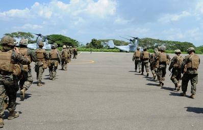 | Keywords: USS America visit 140719-N-YB590-045.jpg en Marines assigned to Special Purpose Marine Air Ground Task Force SPMAGTF South prepare to board two MV-22 Osprey assigned to the Argonauts of Marine Operational and Test Evaluation Squadron VMX 22 after completing a bilateral training exercise with Colombian marines known as Infanteria de Marina at the International Center for Amphibious Training located in Covenas Colombia SPMAGTF is a balanced air ground and logistics force that can be tailored to accomplish missions across a wide range of crises is embarked aboard the future amphibious assault ship USS America LHA 6 America is traveling through the U S Southern command and the U S 4th Fleet area of responsibility on her maiden transit America Visits the Americas America is the first ship of its class replacing the Tarawa-class of amphibious assault ships As the next generation of big-deck amphibious assault ship America is optimized for aviation capable of supporting current and future aircraft such as the Osprey and F-35B Joint Strike Fighter The ship is scheduled to be ceremoniously commissioned Oct 11 in San Francisco U S Navy photo by Mass Communication Specialist 1st Class John Scorza/Released 2014-07-19 Petty Officer 2nd Class John Scorza Jr https //www dvidshub net/image/1475106 140719-N-YB590-045 2014-07-31 22 10 COVENAS CO PD-USGov-Military-Navy MV-22B Osprey USS America LHA-6 Images from DoD uploaded by Fæ |