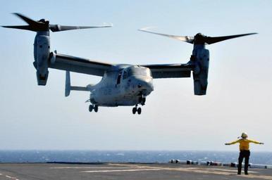 | Keywords: USS America visits the Americas 140719-N-AC979-121.jpg en A U S Navy aviation boatswain's mate handling directs an MV-22 Osprey tiltrotor aircraft carrying Marines assigned to Special Purpose Marine Air-Ground Task Force South to land on the flight deck of the newly commissioned amphibious assault ship USS America LHA 6 in the Caribbean Sea following bilateral training with Colombian service members July 19 2014 The America embarked on a mission to conduct training engagements with partner nations throughout the Americas before reporting to its new home port of San Diego The America was set to be ceremoniously commissioned Oct 11 2014 U S Navy photo by Mass Communication Specialist 1st Class Michael McNabb/Released 2014-07-19 Petty Officer 3rd Class Michael McNabb https //www dvidshub net/image/1461847 140719-N-AC979-121 2014-07-24 00 01 USS AMERICA LHA 6 AT SEA PD-USGov-Military-Navy MV-22B Osprey USS America LHA-6 Special Purpose Marine Air-Ground Task Forces Images from DoD uploaded by Fæ |