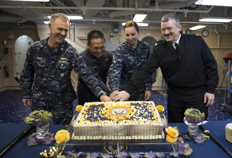 Keywords: USS America's celebration of the Navy’s 239th birthday 141013-N-LD343-002.jpg en Capt Michael W Baze left executive officer of amphibious assault ship USS America LHA 6 and Capt Robert A Hall Jr right America ™s commanding officer cut the Navy birthday cake with the oldest crew member Chief Warrant Officer 4 Edwin Carpio and the youngest crew member Seaman Harley Dewitt in celebration of the Navy ™s 239th birthday America was recently commissioned during San Francisco Fleet Week 2014 and is the first ship of its class and the fourth to bear the name She replaces the Tarawa-class of amphibious assault ship as the next generation big-deck amphibious assault ship and is optimized for aviation and capable of supporting current and future aircraft such as the MV-22 Osprey and F-35B Joint Strike Fighter U S Navy photo by Mass Communication Specialist 1st Class Demetrius Kennon/Released 2014-10-13 Petty Officer 1st Class Demetrius Kennon https //www dvidshub net/image/1613002 141013-N-LD343-002 2014-10-14 03 21 SAN FRANCISCO CA US PD-USGov-Military-Navy MV-22B Osprey USS America LHA-6 Images from DoD uploaded by Fæ