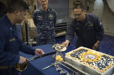 | Keywords: USS America's celebration of the Navy’s 239th birthday 141013-N-LD343-003.jpg en Chief Warrant Officer 4 Edwin Carpio oldest crew member on board amphibious assault ship USS America LHA 6 receives a slice of birthday cake commemorating the Navy ™s 239th birthday America was recently commissioned during San Francisco Fleet Week 2014 and is the first ship of its class and the fourth to bear the name She replaces the Tarawa-class of amphibious assault ship as the next generation big-deck amphibious assault ship and is optimized for aviation and capable of supporting current and future aircraft such as the MV-22 Osprey and F-35B Joint Strike Fighter U S Navy photo by Mass Communication Specialist 1st Class Demetrius Kennon/Released 2014-10-13 Petty Officer 1st Class Demetrius Kennon https //www dvidshub net/image/1613004 141013-N-LD343-003 2014-10-14 03 21 SAN FRANCISCO CA US PD-USGov-Military-Navy MV-22B Osprey USS America LHA-6 Images from DoD uploaded by Fæ |