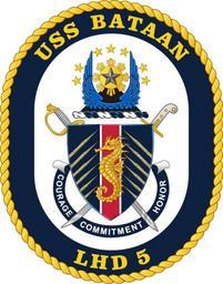 | Keywords: USS Bataan COA.png en Emblem of the USS Bataan LHD-5 2011-06-09 United States Army Institute of Heraldry Member of the Armed Forces of the United States PD-USGov Blazon SHIELD Azure a pale Gules fimbriated Argent between twelve bamboo spear points chevronwise six and six and overall a seahorse Or CREST From a wreath Argent and Azure a mount Sable superimposed by a stylized sun Or bearing a mullet of the first encircled in base by a vol of the second all within an arc of seven mullets of the fourth two three and two MOTTO A scroll Azure doubled and inscribed COURAGE COMMITMENT HONOR ARGENT SUPPORTERS A United States Navy and a Marine Corps Officer ™s sword saltirewise points down Proper SEAL The coat of arms in full color as in the blazon all upon a white background and enclosed within a dark blue oval border edged on the outside with a gold rope and bearing the inscription USS BATAAN at top and LHD 5 in base all gold Symbolism SHIELD Dark blue and gold are the traditionally Navy colors and reflect the sea and excellent Red denotes courage and sacrifice white is for integrity The seahorse is the symbol of the American Defenders of Bataan and Corregidor The red pale commemorates the 70 mile Bataan Death March The spears form a wedge underscoring amphibious assault and deployment of men and cargo ashore as well as combat readiness while highlighting the USS Bataan ™s 12 battle stars Bamboo alludes to the tropics and the Pacific Theater where the first USS Bataan served; during the Death March the sides of the road were lined with angled bamboo spear points CREST The wings represent aviation and the heritage of the ship The gold stars are for the seven battle stars earned in Korea while the five points of the central star are for World War II battle stars The black mount suggests the mountainous terrain of Korea; the sun is adapted from the Philippine state arms SUPPORTERS The swords represent the Navy-Marine Corps Team Uploaded with UploadWizard United States Navy landing ships emblems LHD-5 Amphibious assault ships of the United States USS Bataan LHD-5 |