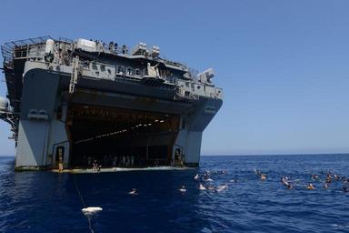 | Keywords: USS Bataan swim call 140614-N-JX484-339.jpg en Sailors and Marines from the multipurpose amphibious assault ship USS Bataan LHD 5 participate in a swim call June 14 Bataan with elements of the 22nd Marine Expeditionary Unit is operating in the U S 6th Fleet area of operations to augment U S crisis response forces in the region U S Navy photo by Mass Communication Specialist 3rd Class Mark Hays/Released <br>Unit USS Bataan LHD 5 2014-06-14 Petty Officer 3rd Class Mark Hays https //www dvidshub net/image/1405378/uss-bataan-swim-call 140614-N-JX484-339 2014-06-18 05 40 MEDITERRANEAN SEA PD-USGov-Military-Navy USS Bataan LHD-5 22nd Marine Expeditionary Unit Images from DoD uploaded by Fæ |