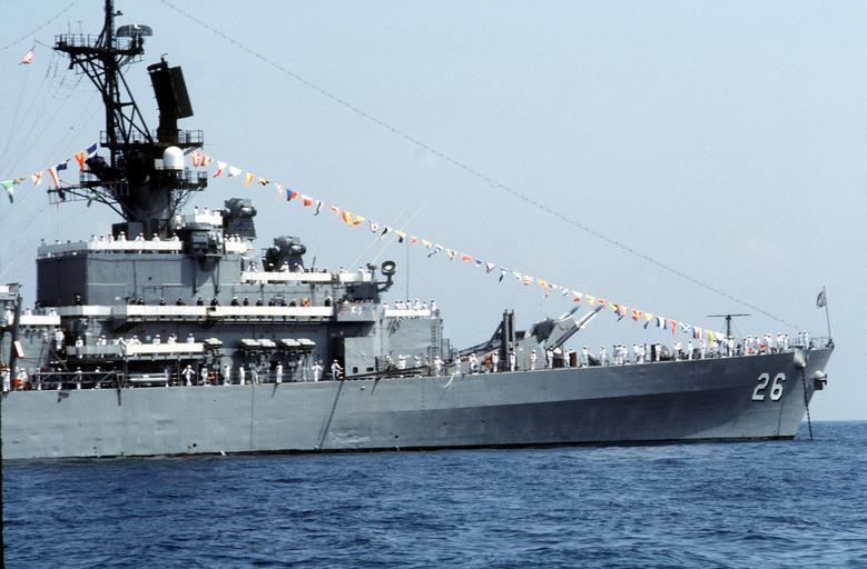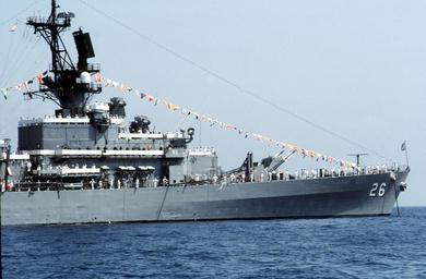 | Keywords: USS Belknap bow.jpg Crewmembers man the rails at the stern of the guided missile cruiser USS BELKNAP CG 26 as the ship lies at anchor in a Mediterranean port Location UNKNOWN DN-ST-91-00167 Navy http //www defenseimagery mil/imagery html guid 1d059569ce7349d787f9eff0b5eaa629ec9e7468 1990-10-04 Photographer's Name JO3 John Aitchison PD-USGov-Military-Navy United States Navy images location unknown USS Belknap CG-26 Manning the rail in the United States Navy Ship dressing | ||||