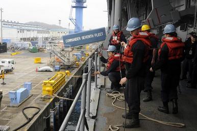 | Keywords: USS Blue Ridge action 150309-N-TV402-014.jpg en 150309-N-TV402-014 YOKOSUKA Japan - Sailors attached to the U S 7th Fleet flagship USS Blue Ridge reattach safety lines after the removal of the aft brow Blue Ridge is currently underway conducting unit level training to assess the crew on damage control force protection and seamanship in preparation for upcoming patrols in the 7th Fleet area of operations 2015-03-09 March 9 2015 https //www dvidshub net/image/1808100 150309-N-TV402-014 2015-03-11 00 02 USS BLUE RIDGE JP PD-USGov-Military-Navy USS Blue Ridge LCC-19 Images from DoD uploaded by Fæ |