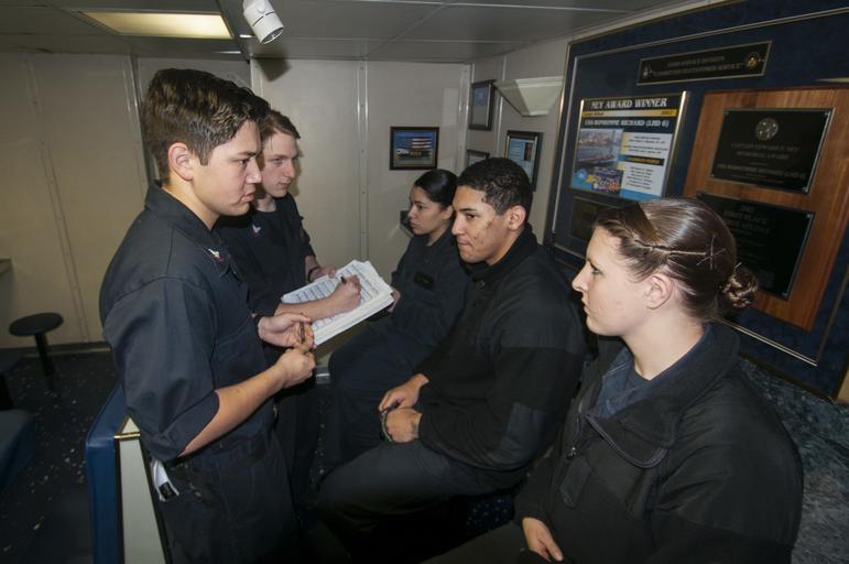 | Keywords: USS Bonhomme Richard activity 150403-N-GZ638-042.jpg en 150403-N-GZ638-042 WATERS EAST OF THE KOREAN PENINSULA - Sailors participate in an Enlisted Surface Warfare Specialist board in the ace cafe aboard forward-deployed amphibious assault ship USS Bonhomme Richard Bonhomme Richard is the lead ship of the Bonhomme Richard Amphibious Ready Group and along with the embarked 31st Marine Expeditionary Unit is currently underway in the 7th Fleet Area of Operations 2015-04-03 Apr 3 2015 https //www dvidshub net/image/1854564 150403-N-GZ638-042 2015-04-03 10 04 USS BONHOMME RICHARD EAST CHINA SEA AT SEA PD-USGov-Military-Navy 31st Marine Expeditionary Unit USS Bonhomme Richard LHD-6 Images from DoD uploaded by Fæ |
