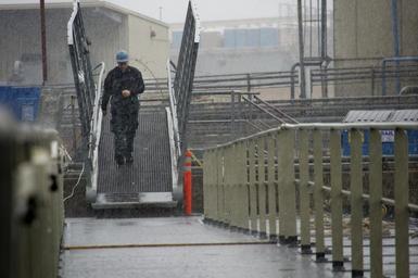 | Keywords: USS Bonhomme Richard DVIDS352447.jpg en A sailor assigned to the amphibious assault ship USS Bonhomme Richard walks the causeway between the ship and the messing and berthing barge during a rainstorm Areas of California are under a state of emergency because of severe rains and flooding Bonhomme Richard is in dry dock for maintenance and upgrades 2010-12-21 Joe Kane https //www dvidshub net/image/352447 101221-N-+++++-383 2010-12-23 00 08 SAN DIEGO CA US PD-USGov-Military-Navy USS Bonhomme Richard LHD-6 Images from DoD uploaded by Fæ Photographs by Joseph Kane |