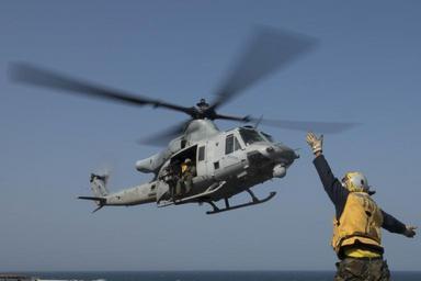 | Keywords: USS Bonhomme Richard, Flight ops 150330-N-NP779-015.jpg en 150330-N-NP779-015 WATERS TO THE EAST OF THE KOREAN PENINSULA - Aviation Boatswain ™s Mate Handling Airman Newton Armstrong from Carson Calif a landing signalman enlisted signals a departing helicopter from the flight deck of the forward-deployed amphibious assault ship USS Bonhomme Richard U S Sailors and Marines from the Bonhomme Richard Amphibious Ready Group and the 31st Marine Expeditionary Unit are participating in the Korean Marine Exchange Program in the Republic of Korea with the ROK Marine Corps and Navy The Bonhomme Richard ARG is comprised of the amphibious assault ship USS Bonhomme Richard the amphibious transport dock ship USS Green Bay the Whidbey-island class amphibious dock landing ship USS Ashland and the embarked 31st MEU 2015-03-30 March 30 2015 https //www dvidshub net/image/1844831 150330-N-NP779-015 2015-03-30 07 50 USS BONHOMME RICHARD WATERS TO THE EAST OF THE KOREAN PENINSULA AT SEA PD-USGov-Military-Navy 31st Marine Expeditionary Unit USS Bonhomme Richard LHD-6 Images from DoD uploaded by Fæ |
