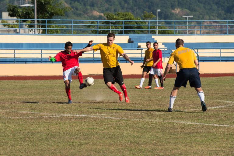| Keywords: USS Bonhomme Richard sailors play soccer in Malaysia 150224-N-UF697-232.jpg en 150224-N-UF697-232 SEPANGGAR Malaysia Feb 24 2015 Sailors and Marines assigned to the forward-deployed amphibious assault ship USS Bonhomme Richard LHD 6 play a soccer game against sailors from the Royal Malaysian navy during a scheduled port visit Bonhomme Richard is the lead ship of the Bonhomme Richard Amphibious Ready Group comprised of USS Ashland LSD 48 USS Germantown LSD 42 and the newest member USS Green Bay LPD 20 The purpose of the port call in Malaysia is to continue to build key diplomatic and military relationships and to illustrate the U S Navy ™s commitment to broadening the robust ties with their regional Asia-Pacific partners During Bonhomme Richard ™s visit the crew will engage in community relations events and sports activities and will host tours of the ship for the local residents U S Navy photo by Mass Communication Specialist 3rd Class Kevin V Cunningham/Released 2015-02-23 Petty Officer 3rd Class Kevin Cunningham https //www dvidshub net/image/1794529 150224-N-UF697-232 2015-03-03 02 55 SEPANGGAR MY PD-USGov-Military-Navy USS Ashland LSD-48 USS Bonhomme Richard LHD-6 USS Germantown LSD-42 USS Green Bay LPD-20 Images from DoD uploaded by Fæ |