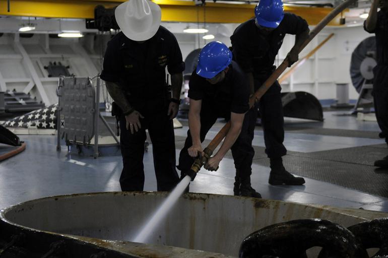 | Keywords: USS Carl Vinson action 120429-N-RG587-098.jpg en U S Navy Seaman Michael Snook uses a fire hose to clean the anchor and anchor chain as they are raised aboard the aircraft carrier USS Carl Vinson CVN 70 April 29 2012 as the ship departs Perth Australia after a port visit Carl Vinson and Carrier Air Wing CVW 17 were deployed to the U S 7th Fleet area of responsibility U S Navy photo by Mass Communication Specialist Seaman Dean M Cates 2012-04-29 Petty Officer 2nd Class Dean Cates https //www dvidshub net/image/573818 120429-N-RG587-098 2012-05-06 14 28 USS CARL VINSON CVN 70 AT SEA PD-USGov-Military-Navy USS Carl Vinson CVN-70 Images from DoD uploaded by Fæ |