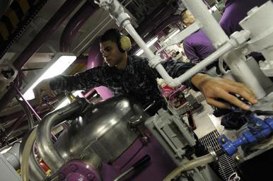 | Keywords: USS Carl Vinson action DVIDS351908.jpg en Airman Apprentice Jermaine Thornton aviation boatswain's mate turns valves to add water to a purifier to avoid overheating in a JP-5 fuel pump room aboard the aircraft carrier USS Carl Vinson Carl Vinson and Carrier Air Wing 17 are on a three-week composite training unit exercise followed by a deployment to the U S 7th and 5th Fleet areas of responsibility 2010-12-18 fuel https //www dvidshub net/image/351908 101218-N-+++++-139 2010-12-21 16 19 USS CARL VINSON USAFRICOM AT SEA PD-USGov-Military-Navy USS Carl Vinson CVN-70 Images from DoD uploaded by Fæ |