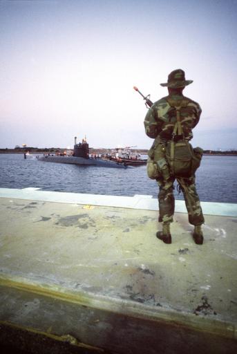 Keywords: outdoor A member of Marine Detachment Security Group 6, part of a Fleet Anti-terrorist Security Team (FAST), watches as the large harbor tugs Tomahawk (YTB-789) and Paducah (YTB-758) guide the nuclear-powered strategic missile submarine USS CASIMIR PULASKI (SSBN-633) to the pier. The FAST and the PULASKI are participating in exercise LantCoopEx 1-89, 5/1/1989 Port Canaveral, Florida Camera Operator: PH1(Sw) J. Alan Elliott National Archives Series: Combined Military Service Digital Photographic Files, 1982 - 2007 Record Group 330: Records of the Office of the Secretary of Defense, 1921 - 2008 A member of Marine Detachment Security Group 6, part of a Fleet Anti-terrorist Security Team (FAST), watches as the large harbor tugs Tomahawk (YTB-789) and Paducah (YTB-758) guide the nuclear-powered strategic missile submarine USS CASIMIR PULASKI (SSBN-633) to the pier. The FAST and the PULASKI are participating in exercise LantCoopEx 1-89, 5/1/1989 Port Canaveral, Florida Camera Operator: PH1(Sw) J. Alan Elliott National Archives Series: Combined Military Service Digital Photographic Files, 1982 - 2007 Record Group 330: Records of the Office of the Secretary of Defense, 1921 - 2008 |