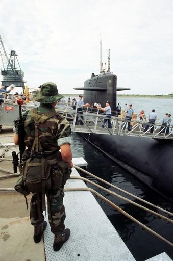 Keywords: outdoor A member of Marine Detachment Security Group 6, part of a Fleet Anti-terrorist Security Team (FAST), watches from the pier as the crew of the nuclear-powered strategic missile submarine USS CASIMIR PULASKI (SSBN 633) resupplies their vessel Exercise LANTCOOPEX 1-89. The Marine is armed with an M16A2 rifle equipped with a telescopic sight and blank firing attachment, 5/1/1989 Port Canaveral, Florida Camera Operator: PH1(Sw) J. Alan Elliott National Archives Series: Combined Military Service Digital Photographic Files, 1982 - 2007 Record Group 330: Records of the Office of the Secretary of Defense, 1921 - 2008 A member of Marine Detachment Security Group 6, part of a Fleet Anti-terrorist Security Team (FAST), watches from the pier as the crew of the nuclear-powered strategic missile submarine USS CASIMIR PULASKI (SSBN 633) resupplies their vessel Exercise LANTCOOPEX 1-89. The Marine is armed with an M16A2 rifle equipped with a telescopic sight and blank firing attachment, 5/1/1989 Port Canaveral, Florida Camera Operator: PH1(Sw) J. Alan Elliott National Archives Series: Combined Military Service Digital Photographic Files, 1982 - 2007 Record Group 330: Records of the Office of the Secretary of Defense, 1921 - 2008 |