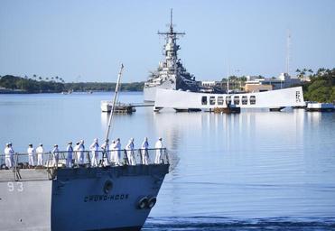 | Keywords: USS Chung-Hoon operations 141207-N-WX111-025.jpg en The guided-missile destroyer USS Chung-Hoon DDG 93 conducts a pass-in-review by the USS Arizona Memorial during the 73rd Anniversary Pearl Harbor Day commemoration ceremony at the Pearl Harbor Visitor Center More than 2 000 guests including Pearl Harbor survivors and other veterans attended the National Park Service and U S Navy-hosted joint memorial ceremony at the World War II Valor in the Pacific National Monument This year's theme focused on Preserving the Memory U S Navy photo by Mass Communication Specialist 1st Class Katherine Hofman/Released 2014-12-05 Petty Officer 1st Class Katherine Hofman https //www dvidshub net/image/1718523 141207-N-WX111-025 2015-01-09 14 09 PEARL HARBOR HI US PD-USGov-Military-Navy USS Arizona Memorial USS Chung-Hoon DDG-93 Images from DoD uploaded by Fæ |