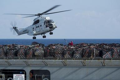 | Keywords: USS Comstock operations 150114-N-CU914-281.jpg en A Military Sealift Command-contracted AS-332 Super Puma helicopter attached to dry cargo/ammunition ship USNS Carl Brashear T-AKE 7 approaches to hook a load of cargo for delivery to dock landing ship USS Comstock LSD 45 during a replenishment-at-sea Comstock part of the Makin Island Amphibious Ready Group is on a deployment with the 11th MEU to promote peace and freedom of the seas by providing security and stability in the U S 7th Fleet area of operations U S Navy photo by Mass Communication Specialist 3rd Class Lenny LaCrosse/Released 2015-01-14 Petty Officer 3rd Class Lenny LaCrosse https //www dvidshub net/image/1724236 150114-N-CU914-281 2015-01-15 07 21 AT SEA PD-USGov-Military-Navy USS Comstock LSD-45 USNS Carl Brashear T-AKE-7 Images from DoD uploaded by Fæ |