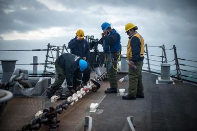 | Keywords: USS Donald Cook operations 150328-N-JN664-049.jpg en 150328-N-JN664-049 ATLANTIC OCEAN March 28 2015 Sailors aboard USS Donald Cook DDG 75 veer out the anchor chain on the ship ™s forecastle March 28 2015 Donald Cook an Arleigh Burke-class guided-missile destroyer forward-deployed to Rota Spain is conducting naval operations in the U S 6th Fleet area of operations in support of U S national security interests in Europe U S Navy photo by Mass Communication Specialist 2nd Class Karolina A Oseguera/Released 2015-03-28 Petty Officer 2nd Class Karolina Oseguera https //www dvidshub net/image/1852915 150328-N-JN664-049 2015-04-02 12 36 USS DONALD COOK ATLANTIC OCEAN AT SEA PD-USGov-Military-Navy USS Donald Cook DDG-75 Images from DoD uploaded by Fæ |