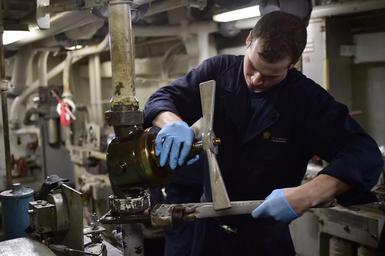 | Keywords: USS Dwight D. Eisenhower (CVN 69) operations 150918-N-ZZ999-020.jpg en 150918-N-ZZ999-020 ATLANTIC OCEAN - Machinist's Mate Fireman Kyle Wood replaces a hydraulic valve below the aircraft elevator on the aircraft carrier USS Dwight D Eisenhower Dwight D Eisenhower is underway conducting carrier qualifications <br>Unit USS Dwight D Eisenhower CVN 69 2015-09-18 Sept 18 2015 https //www dvidshub net/image/2185625/uss-dwight-d-eisenhower-cvn-69-operations 150918-N-ZZ999-020 2015-09-19 08 51 US PD-USGov-Military-Navy USS Dwight D Eisenhower CVN-69 Images from DoD uploaded by Fæ |