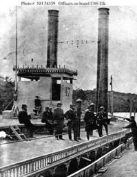 | Keywords: USS Elk (1864-1865).jpg en USS Elk 1864-1865 Officers on the ship's upper deck seen from a similar river steamer during the Civil War Note fancy woodwork around the deck edge and pilothouse roof bullet-proof metal plating and ship's number 47 on the pilothouse and smokestack brace http //www history navy mil/photos/sh-usn/usnsh-e/elk htm Photo NH 54359 U S Naval Historical Center during the Civil War PD-USGov-Military-Navy Steamships of the United States Navy | ||||