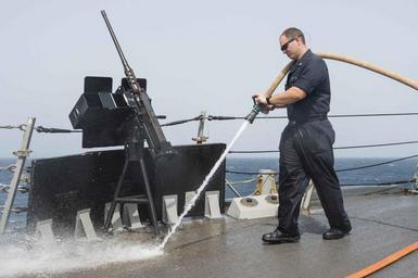 | Keywords: USS Farragut freshwater washdown 150425-N-VC236-020.jpg en 150425-N-VC236-020 ARABIAN GULF - A Sailor assigned to the guided-missile destroyer USS Farragut clean the ship's aft missile deck during a freshwater washdown The wash down helps prevent corrosion of the ship's metal due to exposure to salt water Farragut is deployed to the U S 5th Fleet area of operations conducting maritime security operations 2015-04-25 April 25 2015 https //www dvidshub net/image/1900906 150425-N-VC236-020 2015-04-28 00 02 USS FARRAGUT ARABIAN GULF AT SEA 3 PD-USGov-Military-Navy USS Farragut DDG-99 Images from DoD uploaded by Fæ |