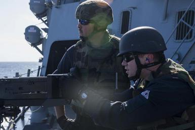 | Keywords: USS Farragut gun shoot 150403-N-VC236-127.jpg en 150403-N-VC236-127 MEDITERRANEAN SEA - Gunner's Mate 1st Class Kody Kuhlers from Lansing Iowa looks on as Logistics Specialist Corey Troglen from Picayune Miss fires a 50-caliber machine gun during a live-fire exercise aboard the Arleigh Burke-class guided-missile destroyer USS Farragut April 3 2015 Farragut homeported in Mayport Florida is conducting naval operations in the U S 6th Fleet area of operations in support of U S national security interests in Europe 2015-04-03 April 3 2015 https //www dvidshub net/image/1859006 150403-N-VC236-127 2015-04-07 00 01 USS FARRAGUT MEDITERRANEAN SEA 4 PD-USGov-Military-Navy USS Farragut DDG-99 Images from DoD uploaded by Fæ |