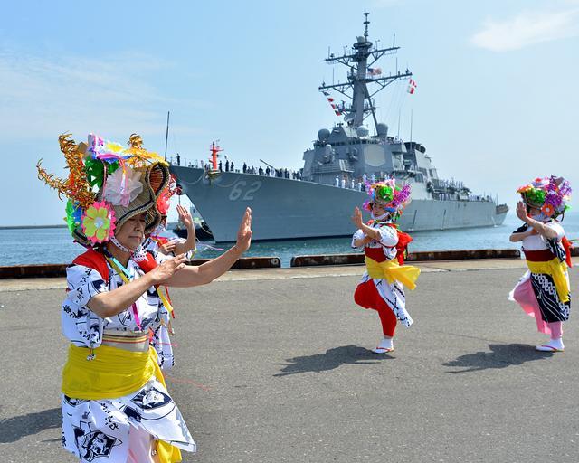 | Keywords: USS Fitzgerald arrives in northern Japan 130805-N-ZI955-061.jpg en Dancers from the Japan Self-Defense Force Parental Association of Aomori perform a traditional Nebuta dance in honor of USS Fitzgerald DDG 62 arriving in Aomori Japan for a port visit Aug 5 2013 While in port Fitzgerald sailors will take part in Nebuta Festival parades experience the local culture and offer assistance at a nearby orphanage U S Navy photo by Senior Chief Mass Communication Specialist Daniel Sanford/Released 2013-08-05 Senior Chief Petty Officer Daniel Sanford https //www dvidshub net/image/988909 130805-N-ZI955-061 2013-08-05 10 13 AOMORI-SHI AOMORI JP PD-USGov-Military-Navy USS Fitzgerald DDG-62 Images from DoD uploaded by Fæ |