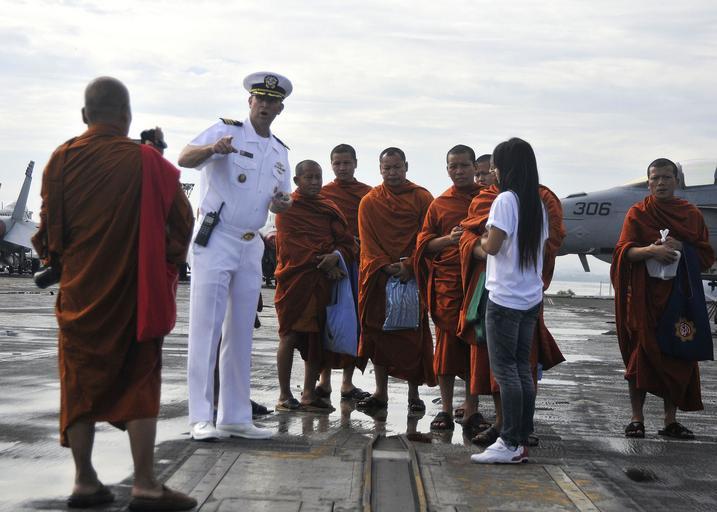 Keywords: USS George Washington DVIDS327545.jpg en Cmdr Pat McClanahan the supply officer aboard the aircraft carrier USS George Washington gives Buddhist monks from the Wat Jitapawan Temple a tour of the ship's flight deck during a scheduled port visit U S Navy photo by Petty Officer 3rd Class David A Cox 2010-10-06 Annalisa Cachin https //www dvidshub net/image/327545 101006-N-+++++-060 2010-10-09 09 16 LEAM CHABANG TH PD-USGov-Military-Navy USS George Washington CVN-73 Images from DoD uploaded by Fæ |