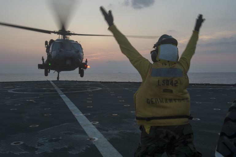 | Keywords: USS Germantown 140909-N-UD469-361.jpg en U S Navy Logistics Specialist Seaman Maretta Stubbs directs an Air Force HH-60G Pave Hawk helicopter assigned to the 33rd Rescue Squadron to land aboard the amphibious dock landing ship USS Germantown LSD 42 in the Philippine Sea Sept 9 2014 The Germantown was part of the Peleliu Amphibious Readiness Group and was underway in the U S 7th Fleet area of responsibility supporting maritime security operations and theater security cooperation efforts U S Navy photo by Mass Communication Specialist 2nd Class Amanda R Gray/Released 2014-09-09 Petty Officer 2nd Class Amanda Gray https //www dvidshub net/image/1583444 140909-N-UD469-361 2014-09-29 17 15 USS GERMANTOWN LSD 42 AT SEA PD-USGov-Military-Navy USS Germantown LSD-42 Images from DoD uploaded by Fæ |