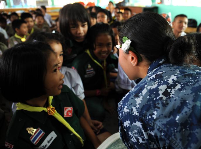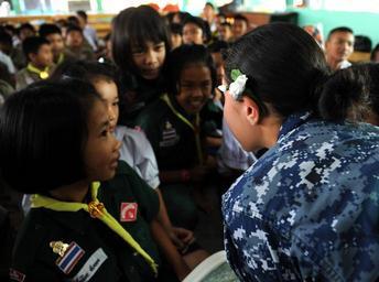 | Keywords: USS Germantown builds relationship with Thai School 120223-N-LP801-020.jpg en Quartermaster Seaman Aldannuvia Dominguez assigned to the forward-deployed amphibious dock landing ship USS Germantown reads a fairytale book to Thai children while participating in a community service project during a port visit to the Kingdom of Thailand Germantown with embarked elements of the 31st Marine Expeditionary Unit is currently underway after participating in exercise Cobra Gold 2012 an annual Thai-U S co-sponsored joint and multinational exercise designed to advance security throughout the Asia-Pacific region and enhance interoperability with participating nations U S Navy photo by Mass Communication Specialist Seaman Raul Moreno Jr 2012-02-23 Seaman Raul Moreno Jr https //www dvidshub net/image/531240 120223-N-LP801-020 2012-02-25 08 02 TH PD-USGov-Military-Navy 31st Marine Expeditionary Unit Images from DoD uploaded by Fæ |