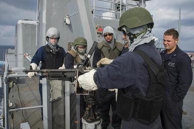 | Keywords: USS Germantown crew-served weapons qualification shoot 141024-N-XM324-740.jpg en Gunner ™s Mate 2nd Class Andrew Mattson from Snowflake Ariz demonstrates how to properly load an M240B machine gun during a live-fire exercise aboard the amphibious dock landing ship USS Germantown LSD 42 Germantown is part of the Peleliu Amphibious Ready Group PELARG14 commanded by Capt Heidi Agle and is conducting joint forces exercises in the U S 7th Fleet area of responsibility U S Navy photo by Mass Communication Specialist Seaman Patrick Dionne/Released 2014-10-24 Seaman Apprentice Patrick Dionne https //www dvidshub net/image/1628853 141024-N-XM324-740 2014-10-25 12 21 USS GERMANTOWN AT SEA PD-USGov-Military-Navy USS Germantown LSD-42 M-240 machine gun Images from DoD uploaded by Fæ |