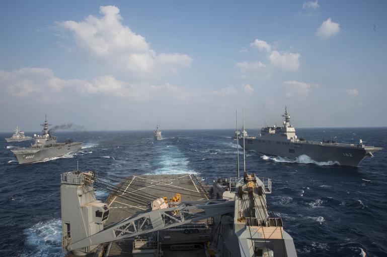 | Keywords: USS Germantown operations 141112-N-XM324-035.jpg en From left to right The guided-missile destroyer USS Halsey DDG 97 the Japanese Maritime Self Defense Force JMSDF tank landing ship JDS Shimokita LST 4002 the JMSDF guided-missile destroyer JDS Chokai DDG 176 the amphibious dock landing ship USS Germantown LSD 42 foreground the JMSDF helicopter destroyer JDS Ise DDH 182 and the JMSDF destroyer JDS Akizuki DD 115 participate in a photo exercise for Keen Sword Exercise Keen Sword is a bilateral field training exercise held biennially since 1986 The exercise is designed to increase the interoperability of U S Forces and the JSDF to effectively and mutually provide for the defense of Japan or respond to a regional crisis or contingency situation in the Asia-Pacific region Germantown is part of the Peleliu Amphibious Ready Group PELARG14 commanded by Capt Heidi Agle and is conducting joint forces exercises in the U S 7th Fleet area of responsibility U S Navy photo by Mass Communication Specialist Seaman Patrick Dionne/Released 2014-11-12 Seaman Apprentice Patrick Dionne https //www dvidshub net/image/1659223 141112-N-XM324-035 2014-11-16 03 48 AT SEA PD-USGov-Military-Navy JS Ise DDH-182 USS Germantown LSD-42 USS Halsey DDG-97 Images from DoD uploaded by Fæ |