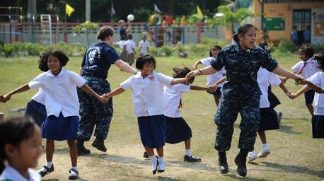 | Keywords: USS Germantown sailors play with children during community service project 120223-N-LP801-170.jpg en Engineman 3rd Class Victoria Moore and Engineman 3rd Class Ia Vang both assigned to the forward-deployed amphibious dock landing ship USS Germantown hold hands with Thai children while participating in a community service project during a port visit to Thailand Germantown with embarked elements of the 31st Marine Expeditionary Unit is underway after participating in exercise Cobra Gold 2012 an annual Thai-U S co-sponsored joint and multinational exercise designed to advance security throughout the Asia-Pacific region and enhance interoperability with participating nations U S Navy photo by Mass Communication Specialist Seaman Raul Moreno Jr 2012-02-23 Seaman Raul Moreno Jr https //www dvidshub net/image/532121 120223-N-LP801-170 2012-02-28 03 27 LAEM CHABANG TH PD-USGov-Military-Navy 31st Marine Expeditionary Unit Images from DoD uploaded by Fæ |