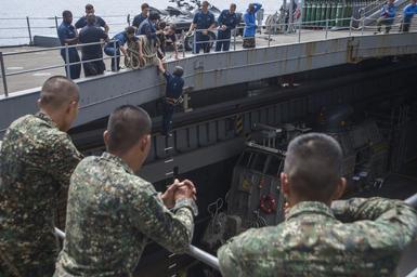 | Keywords: USS Germantown VBSS drill 141003-N-XM324-014.jpg en Members of the Armed Forces of the Philippines watch Fire Controlman 3rd Class Jacob Wright from Newton N C participate in a visit board search and seizure VBSS ladder climb exercise aboard the amphibious dock landing ship USS Germantown LSD 42 during Amphibious Landing Exercise 2015 PHIBLEX15 PHIBLEX15 is an annual bilateral training exercise conducted with the Armed Forces of the Philippines Germantown is part of the Peleliu Expeditionary Strike Group commanded by Rear Adm Hugh Wetherald and is conducting joint forces exercises in the U S 7th Fleet area of responsibility U S Navy photo by Mass Communication Specialist Seaman Patrick Dionne/Released 2014-10-03 Seaman Apprentice Patrick Dionne https //www dvidshub net/image/1605228 141003-N-XM324-014 2014-10-08 04 38 SULU SEA PD-USGov-Military-Navy USS Germantown LSD-42 Images from DoD uploaded by Fæ |