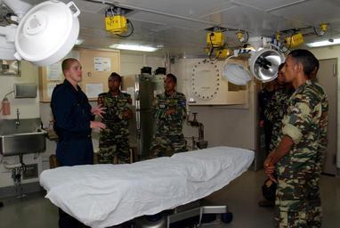 | Keywords: USS Green Bay 121011-N-BB534-402.jpg en Hospital Corpsman 2nd Class Richard Utley gives a tour of the medical bay to sailors from Timor-Leste aboard amphibious transport dock ship USS Green Bay LPD 20 Green Bay is currently participating in Exercise Crocodilo 2012 a multilateral exercise that promotes partnership through community service and training with the Timor-Leste Defense Force F-FDTL U S Navy Photo by Mass Communication Specialist 1st Class SW/AW Elizabeth Merriam 2012-10-11 Petty Officer 2nd Class Elizabeth Merriam https //www dvidshub net/image/721943 121011-N-BB534-402 2012-10-14 09 00 BANDA SEA PD-USGov-Military-Navy USS Green Bay LPD-20 Images from DoD uploaded by Fæ |