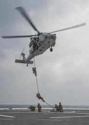 | Keywords: USS Green Bay operations 150310-N-EI510-016.jpg en 150310-N-EI510-016 EAST CHINA SEA Mar 10 2015 Marines attached to 31st Marine Expeditionary Unit MEU fast rope from an MH-60s Seahawk Helicopter attached to the Island Knights of Helicopter Sea Combat Squadron HMS 25 to the flight deck of the forward deployed amphibious transport dock ship USS Green Bay LPD 20 Green Bay is part of the Bonhomme Richard Amphibious Ready Group ARG and along with the embarked 31st Marine Expeditionary Unit 31st MEU is currently conducting an Amphibious Integration Training AIT exercise U S Navy photo by Mass Communication Specialist 3rd Class Scott Barnes/Released 2015-03-10 Seaman Scott Barnes https //www dvidshub net/image/1810324 150310-N-EI510-016 2015-03-12 01 27 USS GREEN BAY EAST CHINA SEA AT SEA PD-USGov-Military-Navy MH-60S Seahawk 31st Marine Expeditionary Unit USS Green Bay LPD-20 Images from DoD uploaded by Fæ |