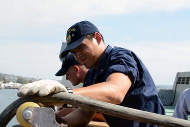 | Keywords: USS Green Bay Sailors prepare cable for magnetic treatment 140819-N-BB534-419.jpg en Ensign Franklin Agli handles a de-energized electrical cable in preparation for a magnetic treatment DEPERM aboard amphibious transport dock ship USS Green Bay LPD 20 The crew of Green Bay is currently in the Basic Phase of training in preparation for forward deployment to Sasebo Japan early next year U S Navy photo by Mass Communication Specialist 1st Class Elizabeth Merriam/Released 2014-08-19 Petty Officer 1st Class Elizabeth Merriam https //www dvidshub net/image/1516776 140819-N-BB534-419 2014-08-21 18 48 SAN DIEGO CA US PD-USGov-Military-Navy USS Green Bay LPD-20 Images from DoD uploaded by Fæ Deperming |