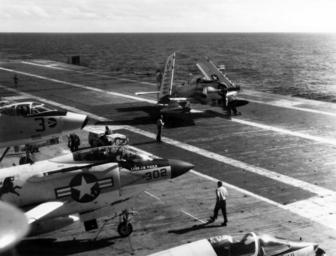 | Keywords: USS Hancock A-1H landing 1963.jpg A U S Navy Douglas A-1H Skyraider of attack squadron VA-215 Barn Owls folding wings and taxies forward on the flight deck of the attack carrier USS Hancock CVA-19 during flight operations off the coast of California in 1963 VA-215 was assigned to Carrier Air Group 21 CVG-21 On the left are a Douglas A-3B Skywarrior of heavy attack squadron VAH-4 Det L Fourrunners a McDonnell F-3B Demon from fighter squadron VF-213 Black Lions and a Vought F-8A Crusader from VF-211 Checkmates U S Navy National Museum of Naval Aviation photo No 1996 253 2979 http //collections naval aviation museum/emuwebdoncoms/pages/doncoms/Display php irn 16002254 QueryPage 2FQuery php 1963 U S Navy PD-USGov-Military-Navy Aboard USS Hancock CV-19 AD-6 A-1H Skyraider Fighter Squadron 211 United States Navy Fighter Squadron 213 United States Navy Attack Squadron 215 United States Navy 1963 in California |