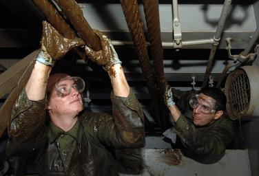 | Keywords: USS Harry S. Truman heads to Persian Gulf DVIDS91884.jpg en Machinist's Mate Fireman Michael Morgan and Machinist's Mate 3rd Class George Colon grease wire rope in an elevator shaft aboard the aircraft carrier USS Harry S Truman Truman and embarked Carrier Air Wing 3 are in the Atlantic Ocean preparing for their return to home port after a seven-month deployment in the Persian Gulf 2008-05-27 left https //www dvidshub net/image/91884 080527-N-+++++-005 2008-06-01 18 32 USNORTHCOM AT SEA PD-USGov-Military-Navy USS Harry S Truman CVN-75 Images from DoD uploaded by Fæ |