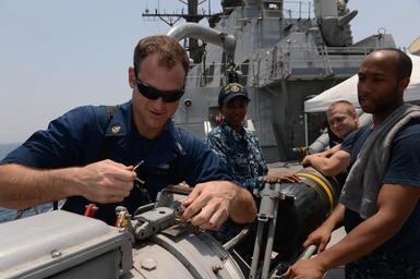 | Keywords: USS Higgins activity 130629-N-ZG290-130.jpg en Chief Fire Controlman Andrew Zalewski left of Clinton Township Mich shows Sailors how to do maintenance on a surface vessel torpedo tube aboard guided-missile destroyer USS Higgins DDG 76 Higgins is deployed to the U S 5th Fleet area of responsibility promoting maritime security operations theater security cooperation efforts and support missions for Operation Enduring Freedom U S Navy photo by Mass Communication Specialist 2nd Class Devin Wray/Released 2013-06-29 Petty Officer 3rd Class Devin Wray https //www dvidshub net/image/968167 130629-N-ZG290-130 2013-07-09 19 14 USS HIGGINS DDG 76 AT SEA PD-USGov-Military-Navy USS Higgins DDG-76 Operation Enduring Freedom Images from DoD uploaded by Fæ |