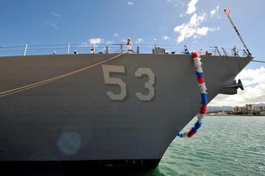 | Keywords: USS John Paul Jones arrives at new home port, Pearl Harbor 140815-N-IU636-154.jpg en A Sailor aboard the guided-missile destroyer USS John Paul Jones DDG 53 supervises as the ship arrives at its new home port Joint Base Pearl Harbor-Hickam following a home port swap with the guided-missile cruiser USS Lake Erie CG 70 The move allows USS Lake Erie to proceed to San Diego for a scheduled extended docking ship repair availability Equipped with updated advanced Aegis capabilities USS John Paul Jones will operate as a rotational ballistics missile defense deployer and testing ship as part of a long-range U S commitment to the security and stability of the Indo-Asia-Pacific region U S Navy photo by Mass Communication Specialist 3rd Class Johans Chavarro/Released 2014-08-15 Petty Officer 3rd Class Johans Chavarro https //www dvidshub net/image/1506082 140815-N-IU636-154 2014-08-15 20 52 PEARL HARBOR HI US PD-USGov-Military-Navy Images from DoD uploaded by Fæ USS John Paul Jones DDG-53 Images from US Navy location Pearl Harbor Hawaii 2014 in Pearl Harbor USS John Paul Jones DDG-53 at Pearl Harbor |