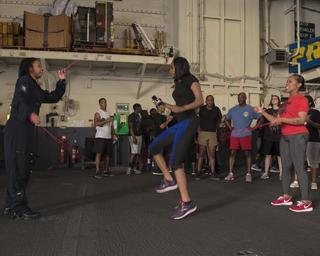 | Keywords: USS Kearsarge activity 160130-N-TT202-315.jpg en 160130-N-TT202-315 GULF OF OMAN Sailors jump rope in the hangar-bay during a steel-beach picnic aboard the amphibious assault ship USS Kearsarge Kearsarge is the flagship for the Kearsarge Amphibious Ready Group and with the embarked 26th Marine Expeditionary Unit is deployed in support of maritime security operations and theater security cooperation efforts in the U S 5th Fleet area of operations <br>Unit USS Kearsarge LHD 3 2016-01-30 Jan 30 2016 https //www dvidshub net/image/2381014/uss-kearsarge-activity 160130-N-TT202-315 2016-02-03 10 07 USS KEARSARGE GULF OF OMAN PD-USGov-Military-Navy 26th Marine Expeditionary Unit Images from DoD uploaded by Fæ |