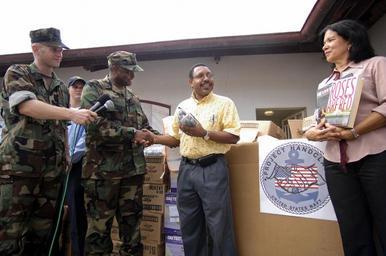 | Keywords: USS Kearsarge Continuing Promise 08 DVIDS124471.jpg en Capt Walter Towns the commanding officer of the amphibious assault ship USS Kearsarge shakes hands with Angelo Ramirez chairman of the Netherlands Antilles Red Cross after unloading a truck with donations from Project Hand Clasp to the Suffisantweg Red Cross Center as part of a the humanitarian service project Continuing Promise 08 Kearsarge is supporting the Caribbean phase of CP an equal-partnership mission between the United States Canada the Netherlands Brazil Nicaragua Colombia Dominican Republic Trinidad and Tobago and Guyana 2008-10-21 Petty Officer 2nd Class Erik Barker https //www dvidshub net/image/124471 081021-N-+++++-008 2008-10-25 15 33 WILLEMSTAD CW PD-USGov-Military-Navy USS Kearsarge LHD-3 Images from DoD uploaded by Fæ |