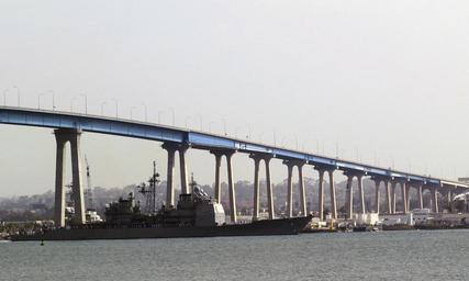 | Keywords: USS Lake Champlain (CG-57) passes under the Coronado Bay Bridge.jpg US Navy USN Sailors aboard the USN Ticonderoga Class Guided Missile Cruiser Aegis USS LAKE CHAMPLAIN CG 57 man the rails as their ship passes under the Coronado Bay Bridge during its returns to its homeport at Naval Base NS San Diego California LAKE CHAMPLAIN completed a regular scheduled deployment in support of the Global War on Terrorism GWOT and Maritime Security Operations MSO Location NAVAL STATION SAN DIEGO CALIFORNIA CA UNITED STATES OF AMERICA USA http //www dodmedia osd mil/Assets/Still/2007/Navy/DN-SD-07-07700 JPEG ID DN-SD-07-07700 / Service Depicted Navy / 060706-N-5617R-038 Date Shot 1 Jan 2002 Camera Operator MCSA RIALYN C RODRIGO USN USS Lake Champlain CG-57 PD-USGov-Military-Navy Naval ship arrivals to Naval Base San Diego Manning the rail in the United States Navy San Diego-Coronado Bridge |